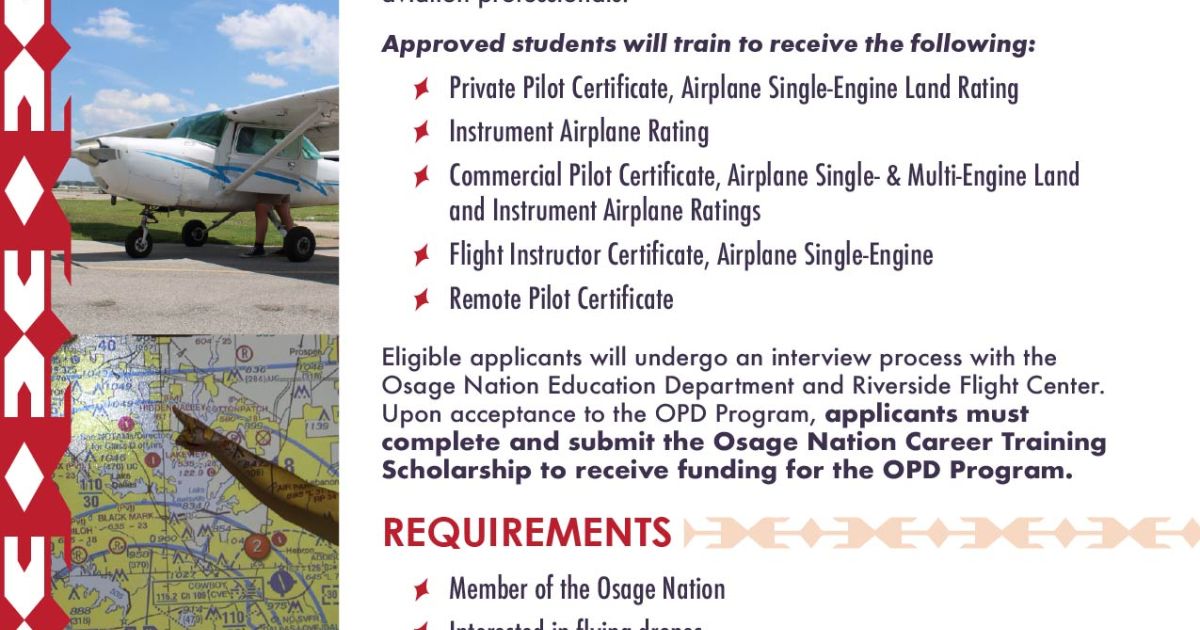 The Osage Nation PathFinder Program addresses the growing demand for STEM professionals through strategic partnerships with aviation industry leader Riverside Flight Center. Training takes place at Riverside Flight Center in Jenks, Okla., providing participants with hands-on, industry-aligned experience. Applicants must be able to commit to the 14-month program based in Tulsa, Oklahoma. The program is funded through the Osage Nation Education Department’s Career Training Scholarship, eliminating financial barriers for qualified participants. Through the PathFinder Program, participants gain technical proficiency in applying STEM principles to aerospace systems and receive all required Federal Aviation Administration (FAA) certifications to fly and instruct both manned and unmanned aircraft for commercial purposes.